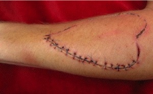 After gagging my mouth with bandages, I then simulated stitching up my lips. At this stage the audience could not tell what was real and what was theatrical effect. The performance ended with the me stripping naked except for a pair of high heeled shoes, then walking through the audience. Almost at the point where I reached the doors, I twisted my ankle, fell, and crawled the remaining distance out onto the street