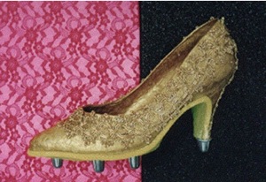 Part II - Steel Toes comprised eight pair of handmade paper shoes, each pair modified in a subtly subversive way - heels cast from erect cocks or balancing on razor blades, soccer studs surrounded by green fake-fur & gold brocade ...